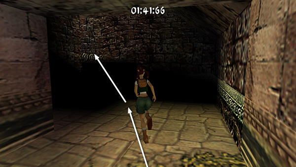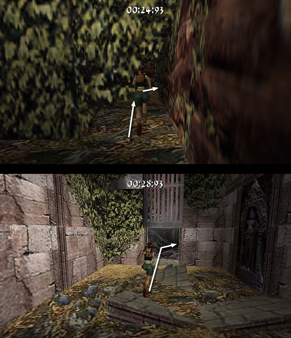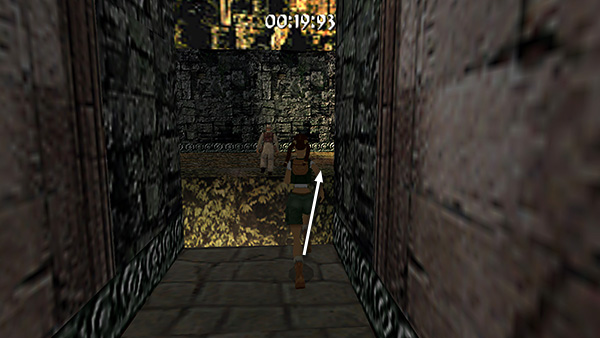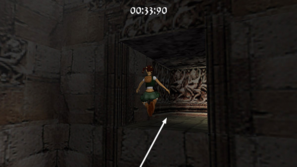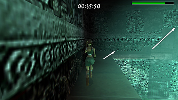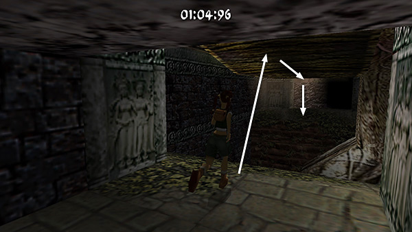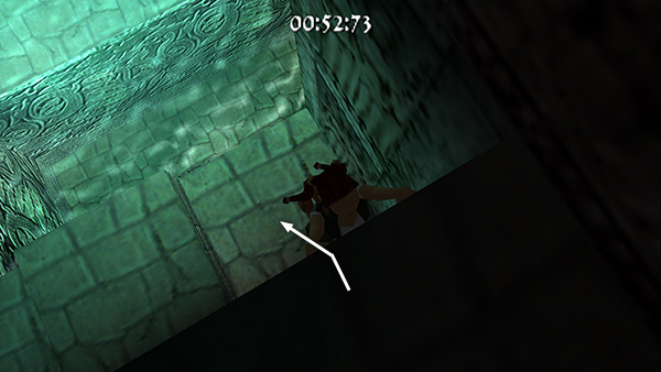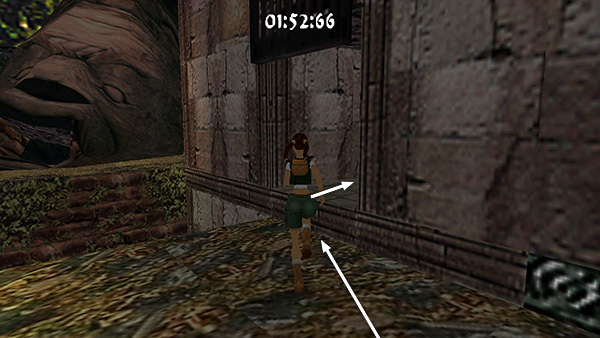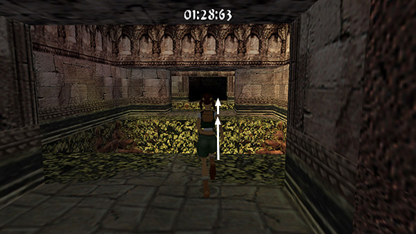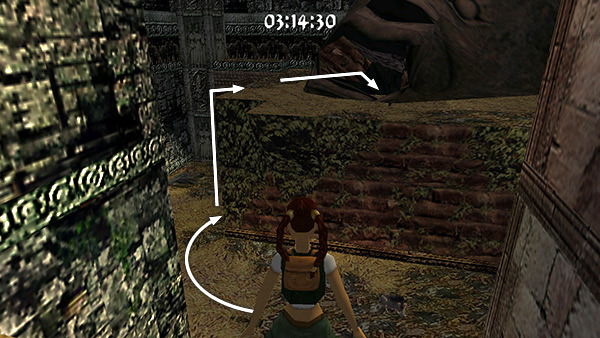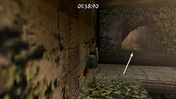 The room beyond the gate contains a shallow pool, which you'll want to avoid to save time. Run around the left edge of the pool, taking running jumps across the corners of the pool if you feel comfortable doing so. (screenshot) Jump up onto the right side of the block at the end of the walkway. (screenshot) Then side flip to the left into the passageway above. (screenshot) Of course you can also just climb up into the passageway, but this takes a little longer.