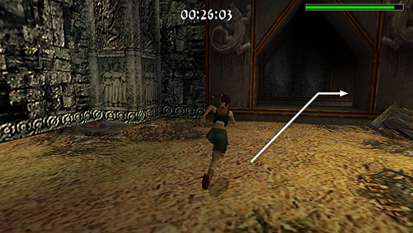 If Von Croy reaches this door before you, he'll pass through and it will begin to close behind him. (screenshot) Either dive through before it closes all the way, or to re-open it, step up to the small, rectangular niche on the wall to the right of the door and press Action. Lara will reach in and operate a mechanism to open the door. (screenshot) This is new to TR4, and you'll be doing it frequently in later levels.