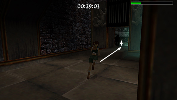 DIFFICULT COURSE: Start by following Von Croy through the doorway. In the more challenging version of this level, it's in the far left corner. (screenshot) Follow the passageway to an open area with 2 pits lined with deadly spikes. If you keep running and jump at the edge of the last gray stone tile in the corridor, Lara should clear the first pit and land near the edge of the second, wider pit. You can then hop back and take a running jump to clear the second pit. (screenshot)