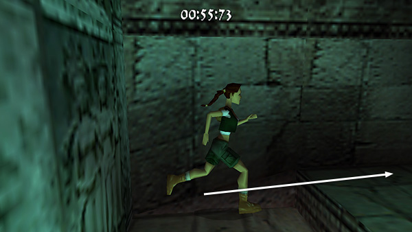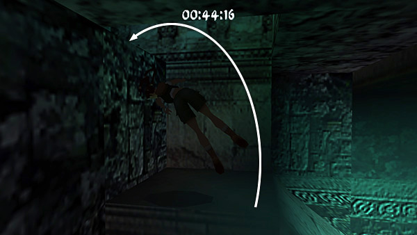 Beyond the gate, turn right and take a standing jump up into the doorway. (screenshot) Follow another twisting passageway to the next open area, where you'll need to take a running jump across a wide pit and grab the opposite edge. Pull up, enter the passageway ahead, and run to the right. (screenshot) (If you fall into this pit while navigating the easier course, there's a block in the far right corner where you can climb out. You'll lose quite a bit of time, though.)