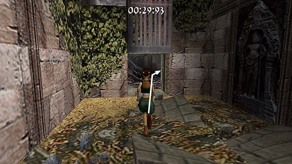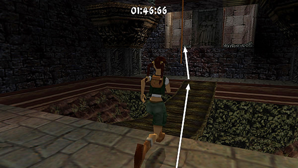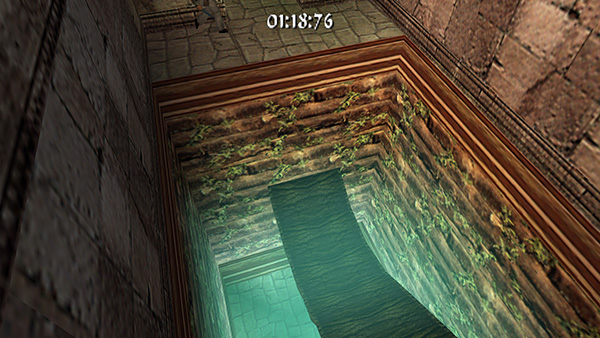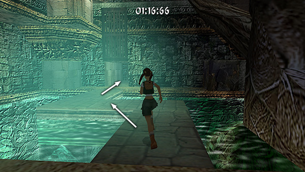 Continue to a wooden bridge spanning another pit. Sprint across the bridge (screenshot) and follow the next twisting passageway to another room with a pool of water. Stick to the walkway so you don't lose precious seconds, but if you like, you can use running jumps to cut corners and get across more quickly. Run through the gate on the other side of the room. (screenshot)