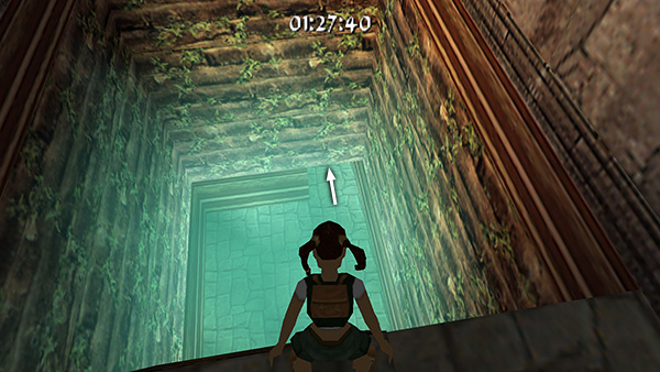 Follow the short passageway, roll and grab the edge, then drop into the room below, which also contains a pool. (screenshot) As soon as Lara hits the ground, turn right (screenshot) and run/sprint around the edge of the pool to the far corner. (screenshot) There's a pile of rocks blocking the path ahead. Don't try and jump over it. Instead make a sharp left turn into the doorway before the rock pile. (screenshot)