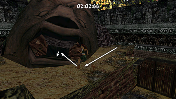 Run across the next wooden bridge. Ignore the dangling vine and jump up into the doorway on the left. (screenshot) Turn left, then immediately turn right into the passageway just before the wide opening overlooking the giant statue head. (screenshot) Continue to a ledge behind the big head. (screenshot) As you run along beside the head, the camera shifts to a wide-angle view. Ignore it and run through the giant statue's open mouth to drop into the room below. (screenshot)
