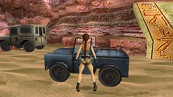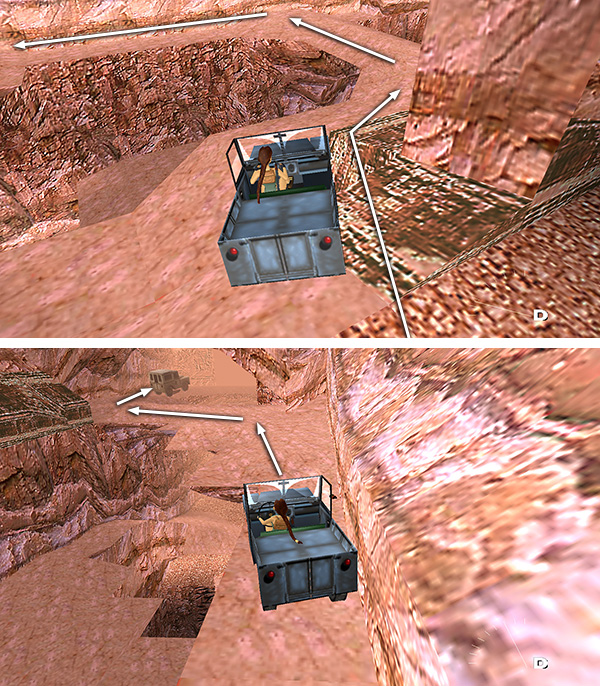 NOTES ON VEHICLES AND CONTROLS: Several players have pointed out that both vehicles are, in fact, Land Rovers and not Jeeps. They do indeed resemble Land Rovers and have the green oval Land Rover emblem on their radiator grilles. And of course the Land Rover is as British as Lara Croft herself. Here I refer to the blue Rover that Lara drives as a "Jeep" because that is how it is listed in the game's instruction manual, and using both terms helps people find these pages in a web search.