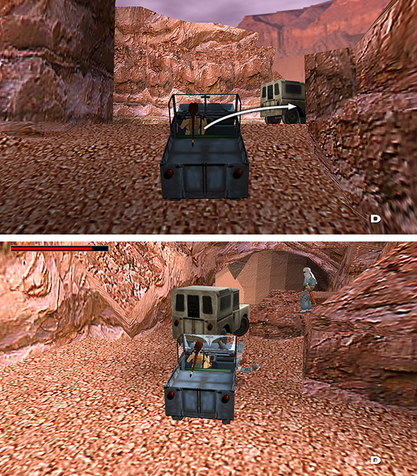 'CAR CHASE' THROUGH CAVES AND CANYONS: When you're ready to move on, approach the driver's side of the JEEP and press Action. (screenshot) Select the IGNITION KEY from inventory and press Action again to use it. Lara gets in and starts the engine. Meanwhile, the not-so-helpful guide begins throwing grenades from the gray Land Rover in front of you. This isn't exactly a car chase, since the guide stops to wait for you if you get out of your Jeep to explore. But you can pretend if you want to. ;-)