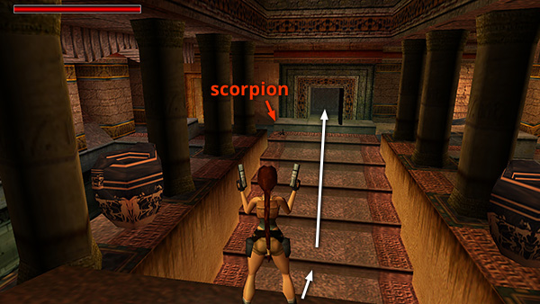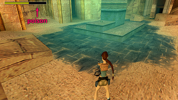 NOTE: Unlike the red scorpions in earlier levels, these guys are venomous. If Lara gets stung, her health bar will turn yellow, showing that she's been poisoned. Her vision will start to blur and waveran interesting effect and worth experiencing if you've got a medipack to spare or have recently saved the game. She'll continue to take damage from poison until you use a medipack. (screenshot)