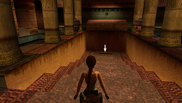 Climb onto the ledge in the middle of the north wall and press the large, square button (screenshot) to open the brown door on the opposite wall, letting in yet another scorpion (11). Hop down onto the wide stairs and shoot the scorpion as you approach the door. (screenshot) Behind the brown door is a small niche. Operate the mechanism inside to lower the CEREMONIAL BOWL, revealing an opening in the floor. (screenshot) Safety drop through this opening into the room below.