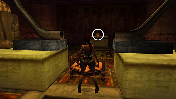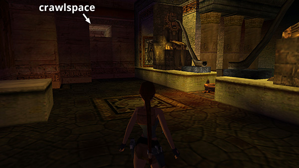 ROOM WITH STAIRS, PITS, AND CEREMONIAL BOWL: On the left wall, just ahead of where you entered, look for an elevated crawlspace between the first two square pillars. (screenshot) Climb in and crawl through the passageway until Lara can stand. Follow the dead-end passageway around to the left for SECRET #4 (29/70), flares and 2 sets of Uzi clips (27-29). Return to the opening and drop back down into the big room.