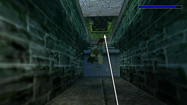 POOL AND FLOODED PASSAGEWAY: Drop down to the floor and jump into the pool. Swim down to the bottom and retrieve some flares (16). Return to the surface for air if necessary. Then swim down through the opening in the side wall. Swim forward and down through the passageway until you come to a square door at the bottom right. Position Lara facing the gray tile at the center of the door and press Action. She'll then open it. Swim through the door and follow the flooded passageway. Just beyond the turn to the left, look for a small, square opening in the ceiling where you can get air. Turn around while treading water and climb out onto the ledge to find SECRET #2 (27/70), Uzi clips and crossbow ammo (17-18), two separate pick-ups. (screenshots)