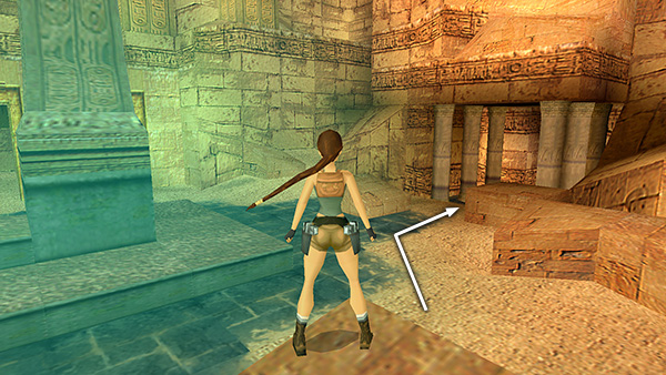 HALLWAY LINED WITH COLUMNS: Enter the ruins here. In the anteroom with the square mosaic in the floor, notice the carved, gray door on the right. You'll return here later. For now, continue up the ramp. There is a pool at the top of the stairs, but Lara will look up to the righta none-too-subtle hint. Use the block to climb onto the ledge above. Turn around and take a running jump over the opening in the floor to the walkway in the center, then a standing jump to the far walkway. Pick up Uzi clips (11) and shotgun shells (12) in the corners. Then jump back to the center walkway and and use the mechanisms in the 2 niches to open the gates. Inside the left alcove is a small medipack (13) on the floor and a SHOTGUN (14)—or shotgun shells if you already have the gun—on the pedestal. Inside the right alcove is another pedestal with CANOPIC JAR 1 (15). (screenshots)