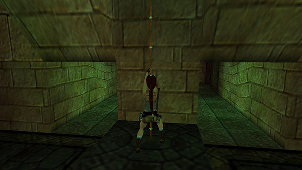 THIRD (SOUTH) ROOM: From the upper doorway facing into the THIRD (SOUTH) ROOM, grab the overhead bars and traverse forward then to the right (west), all the way to the wall, so Lara is hanging in front of the black switch. Release and then quickly re-press Action to pull the switch. (screenshots)