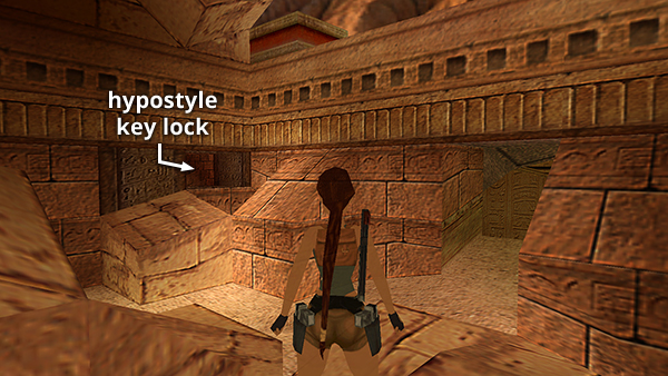 On the far side of the deep pit, continue to the SMALL OPEN SPACE BETWEEN BUILDINGS. (You've been here before too.) This time, go through the crawlspace in the northwest corner (screenshot), follow the passage to the end and use the HYPOSTYLE KEY, which you found in the TEMPLE OF KARNAK (second visit). This opens the door just beside the lock. (screenshot)