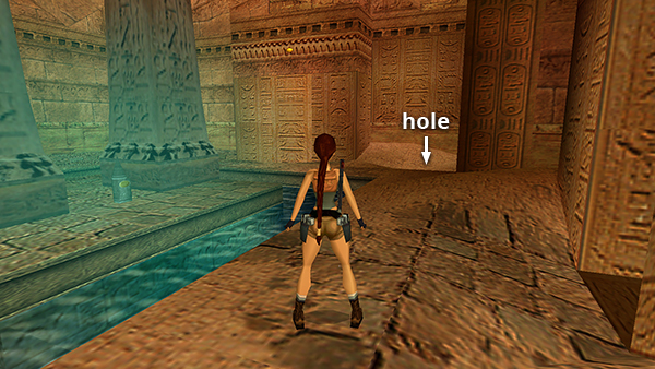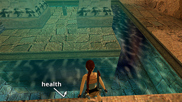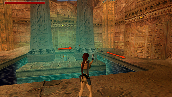SMALL POOL WITH TWO OBELISKS (after activation): The EAST DOOR, through which you entered this area, is now a dead end. The NORTH DOOR contains a crawlspace with a small medipack (4). (screenshot)