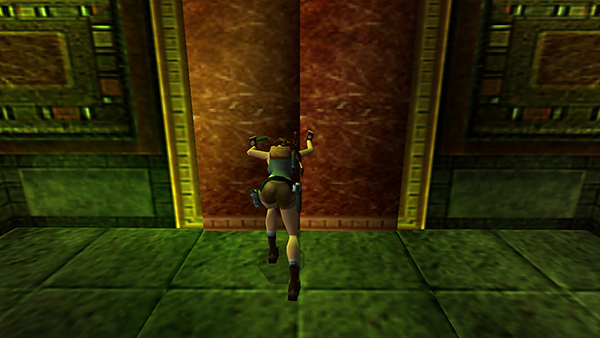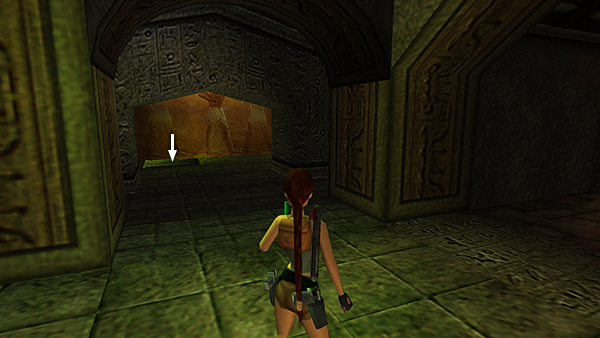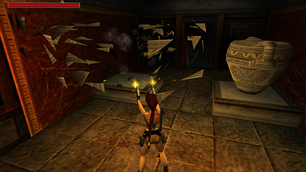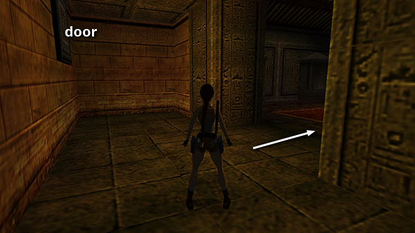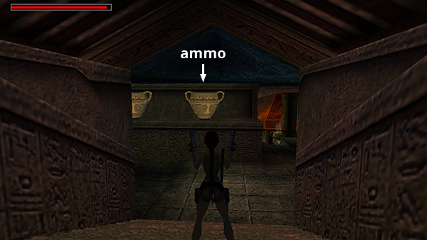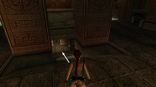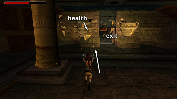 The door on the west wall is now open. Shoot the vase to the left of it, jump over the gap in the floor, and retrieve the small medipack (5) that was inside the vase. (screenshot) When you go through the door, it closes behind you.