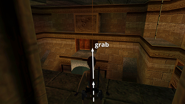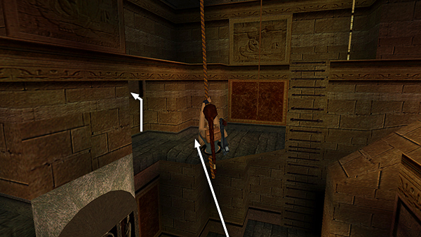 Return downstairs to the high ledge overlooking the LARGE ROOM WITH TWO DANGLING ROPES. Take a running jump to grab the nearer rope. (screenshot) Without letting go, slide to the bottom of the rope and turn until Lara is facing the uneven, gray ledge in the northwest corner. Press Sprint/Dash to swing forward and then jump off the rope to land on the ledge. (screenshot) See the rope swinging tips in the footnote if you need a refresher. Climb into the crawlspace on the left and follow the passage to the next room.
