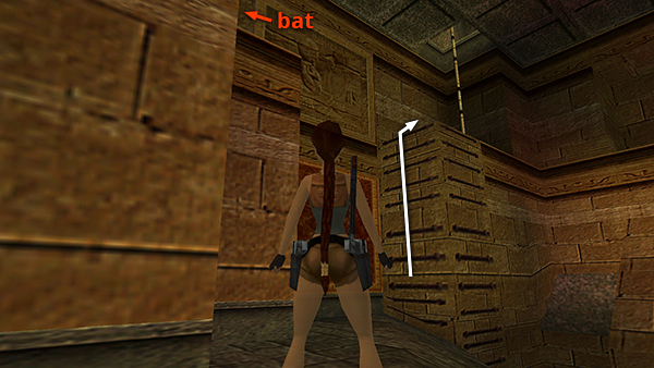 ROOM WITH MIRRORS REFLECTING LIGHT BEAMS: The jackals don't awaken at this time, so no need to worry about them yet. Go through the mirror room and exit at the far left (southeast) corner. (screenshot) Approach the climbing pole and run around the base of it until 2 bats fly down. Shoot them. (screenshot) Then climb the pole. Near the top there are two ledges. Rotate so Lara's back is toward the room with the two rectangular boxes (coffins?), climb up/down so her body is level with or just above the wide stripe on the wall, and then backflip to land on the ledge. (screenshots) Pick up regular and poisoned arrows from behind the coffins. Then jump across the open shaft to the sloping ledge.