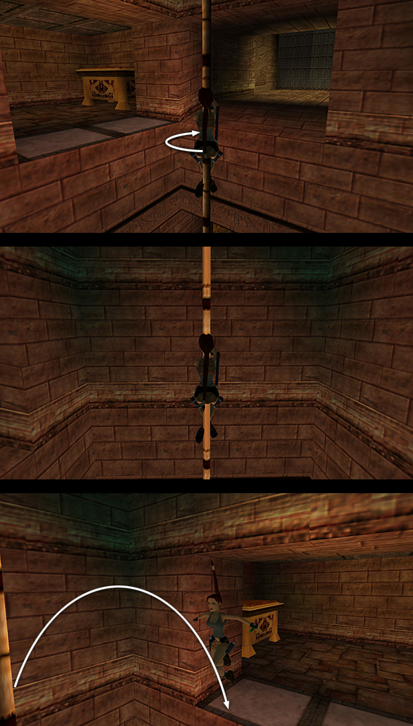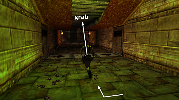 Save the game first, obviously. Position Lara on the south side of the opening surrounding the climbing pole (i.e., Lara will be facing north with the brazier on her right and the 2 ceramic vases on her left). Jump or run off the edge and grab the pole. Slide almost to the bottom. Don't go all the way down or the beetles on the floor below will start biting. Hang onto the pole for a few moments to let the beetles gather. Then press Jump + Roll (or Jump + Up + Down on the keyboard) to jump off the pole, twist in the air, and land beyond the beetle swarm facing the other way (south). Run/jump to the rectangular niche directly ahead. Quickly press Action to grab the small medipack (4) inside. Immediately roll and take a standing jump over the beetles as they begin to swarm around you. Use a health pack if necessary as you continue to run/jump across the room, veering just a little to the left or right to avoid the pole. (screenshots)