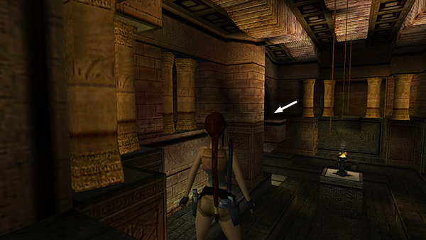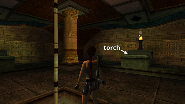 As you explore this room, watch out for the gap around the edges. There's a wooden TORCH (3) lying on the step below the lit brazier. (screenshot) If you like, you can pick it up and light it by standing near the brazier and pressing Action. The torch is supposed to protect Lara from the beetles as she explores the room below, but it doesn't work very well and it prevents her from doing anything else with her hands, such as climbing and activating switches. So it's basically useless. You're welcome to experiment, but here's an alternative that works fairly well. Visuals are included on a separate page with screenshots and in this short video.