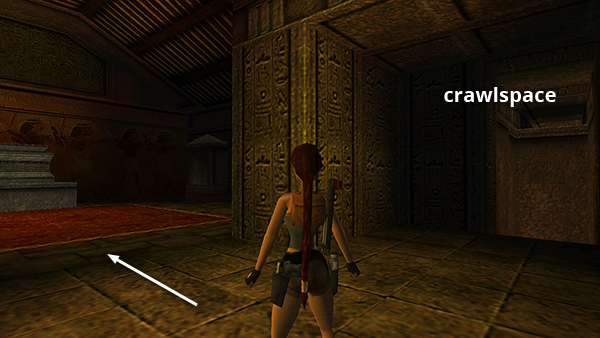 Drop back down onto the cage and follow the hallway to a door that opens as you approach. Hop down into the room below. Off to the right is a high crawlspacethe alternate exit if you win the senet game. (screenshot) Enter the room with the red floor to END THE LEVEL.