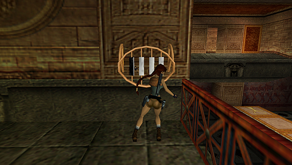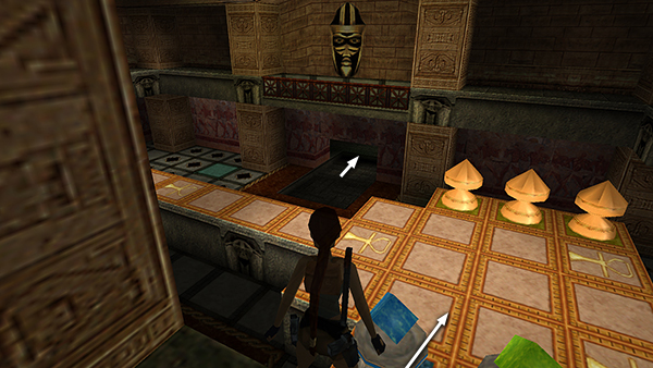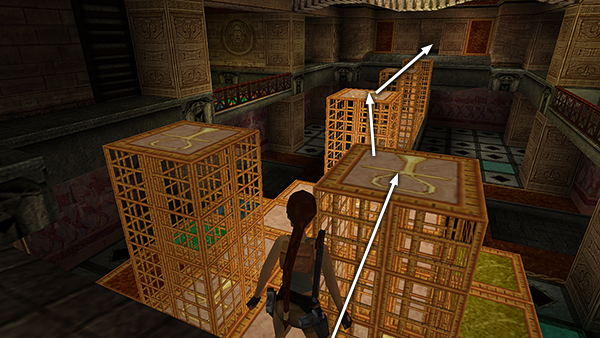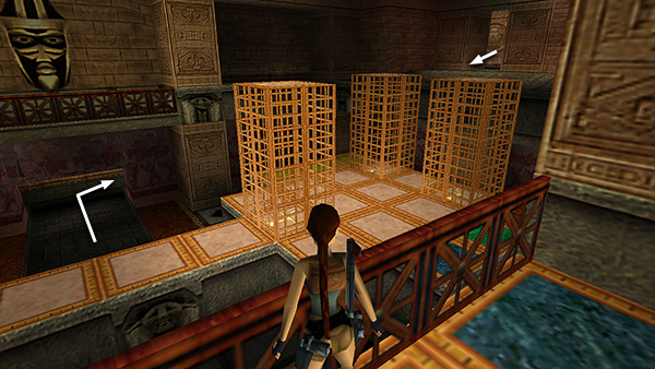 ROOM WITH TWO RAMPS – LEVEL EXIT: Go through the doorway opposite the climbing pole and pull up through the hole in the ceiling into a room with two ramps covered in carved hieroglyphs. There's also a doorway above the ramps and another opening in the ceiling. Turn around and jump to grab the black switch above the hole in the floor. This raises a golden cage between the two ramps. Climb back up through the hole in the ceiling. Go up either ramp and climb onto the cage. Then pull up through the opening in the ceiling above the cage to find SECRET #7 (37/70), the UZIS or Uzi ammo, a large medipack, and explosive arrows (38-40). (screenshots)