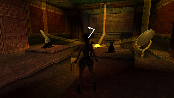 Cutscene: A brief cutscene after each move shows the state of the MIRROR ROOM below. When the final piece is moved, the crypt with the golden crystal slides aside revealing an opening in the floor, and the jackals awaken. (screenshot)