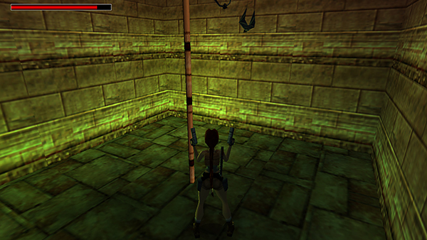 DARK ROOM WITH CLIMBING POLE: Follow the elevated walkway toward the pole. Turn around and shoot the 2 bats (13-14) that drop down from the ceiling behind you. Take a running jump to the base of the pole. Climb the pole until Lara is hanging just above the jutting ledge. Then rotate around the pole so the ledge is behind her and jump back to land there. Shoot another bat (15). (If it doesn't appear right away, just keep going. It'll turn up eventually.) Turn left and take a standing jump to grab the black switch. This raises the hinged ledge behind you. After pulling the switch, Lara falls to the ledge below. Draw pistols and kill another bat (16). Take a standing jump to the base of the pole, climb up, and backflip onto the jutting ledge as you did before. Jump onto the hinged ledge and reach into the niche to get a wooden TORCH (33). (screenshots)