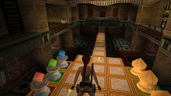 NOTE: If colorblindness makes puzzles like this a challenge for you, the tiles that Lara steps on to move the pieces are red, green, and blue from left to right. The game pieces in their starting positions are blue, green, and red from left to right. You can also download a PC save file for either the winning or losing path.