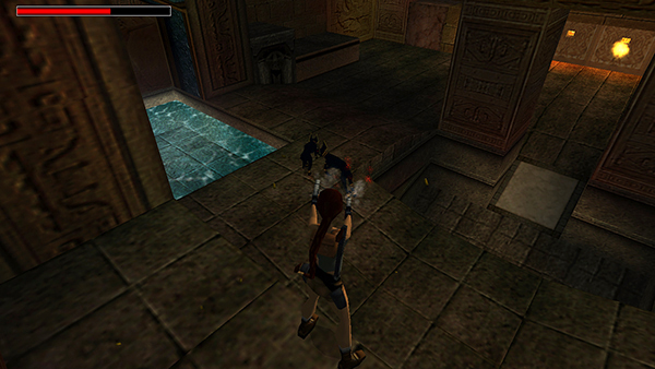 ROOM WITH POOLS AND FLAME NICHES: When you drop down onto the ledge just below the doorway, there's a bit of dramatic music, but the 2 jackals (1-2) lurking behind the square pillars don't emerge until you actually touch down on the floor. If you like, you can hop down and quickly climb/flip back onto the ledge. Then shoot the jackals with pistols. (screenshot)