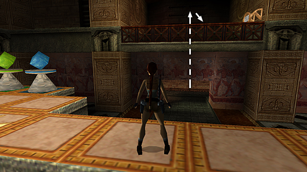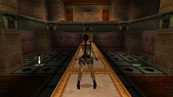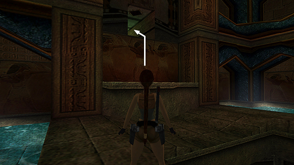 Climb out on the west side but don't run forward or Lara will fall into a deep pit. Jump up to grab the handholds on the ceiling, traverse around the corner, and drop down near the exit, which will be open if you used niche B. As you re-enter this room, the marble block door closes behind you. (screenshots)