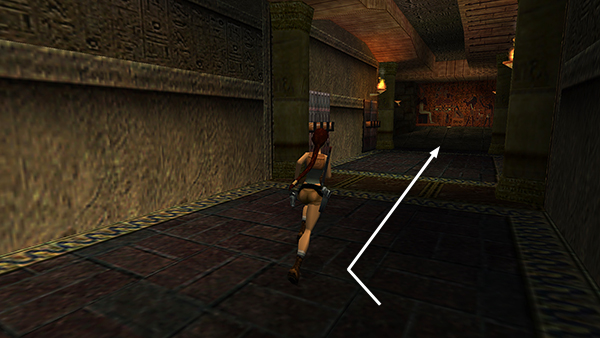 OPENING THE SECRET DOOR: Notice the 2 unlit sconces mounted on the side walls. You'll need to light them in order to open the door in the corner. Reach into the niche to grab a wooden TORCH (10). Run back down the hallway to the bend just before the open doors and lever. Jump onto the small platform (another safe spot) and use the flaming sconce mounted on the wall to light your torch. Wait here on the platform for the GUARDIAN to approach. He should then ram into the wall next to where Lara is standing, giving her a little head start while he sorts himself out. Run back to the room with the 2 sconces and use your torch to light them. This opens the closed door near the torch on the right. (screenshots)
