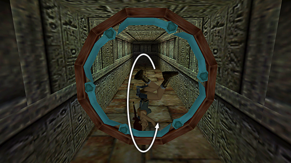 Drop through the hole in the floor directly ahead of the starting position. (screenshot) Slide down the ramp into a hallway with a circular blade trap. To get through, stand Lara as close to the middle of the trap as possible without actually touching the blades, then roll as they open. (screenshot) (Other methods are included in the previous level where you first encounter this type of trap.) Continue around the corner, pass through a second circular blade trap, and then slide down another ramp.