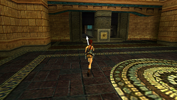 BIG ROOM WITH FLAMING CHANDELIER AND EYE SYMBOLS: Run through the busted door, then sprint down the ramp and up into the middle of the next room. Note the 3 eye symbols on the square blocksone directly ahead as you enter, two flanking the entrance behind you. You'll need to play matador again, positioning Lara in front of each symbol so the GUARDIAN charges and smashes it. Use the Look button so you can see the bull coming and try to jump out of the way as late as possible without getting gored. Use medipacks as needed. (screenshots)