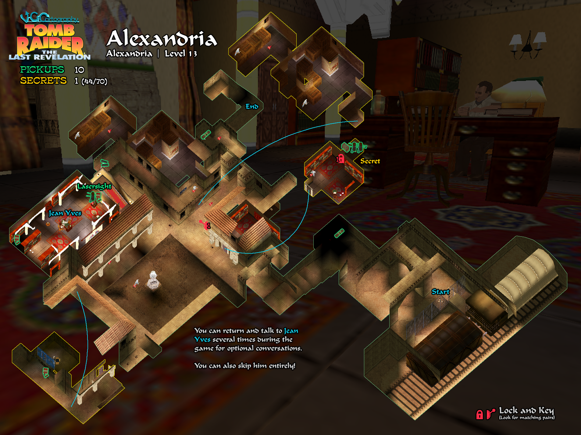 Jean-Yves will have new advice for Lara depending on how far you've progressed in the other levels. Each of these short cutscenes is covered in the Cinematics section and mentioned in the relevant sections of the walkthrough. They are also noted on the ALEXANDRIA FLOWCHART.