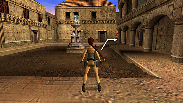 Go out onto the ledge overlooking the COURTYARD and head to the left. Two blue-robed gunmen (6-7) start taking potshots at Lara from the next building. One is just ahead on the right. The other is off to the left. If you'd rather not jump over and confront them, you can run almost to the end of the ledge and target the first gunman without taking fire from the second. Then step out a little farther so Lara can aim at the enemy on the left. (screenshots)