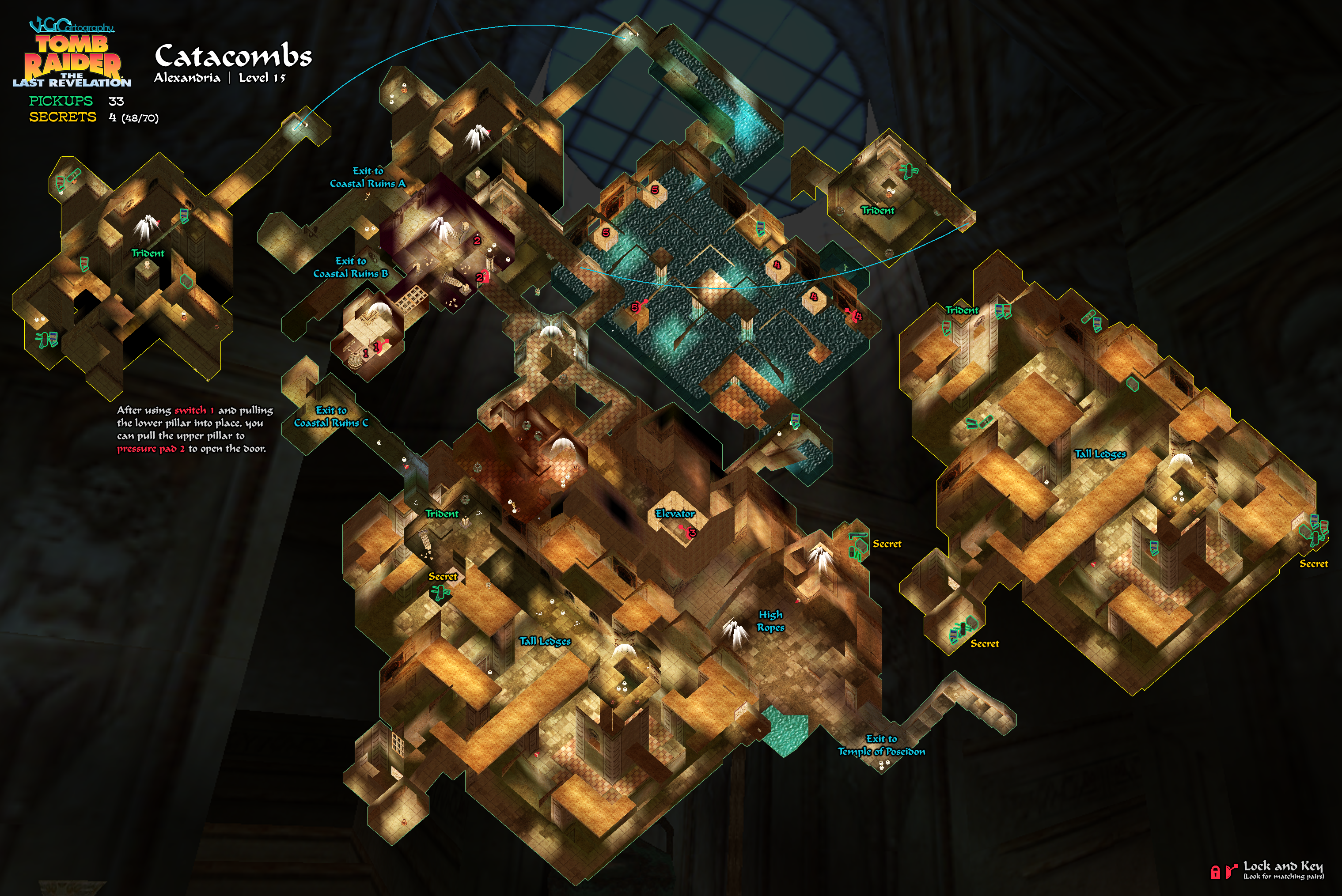 COASTAL RUINS (PREVIOUS LEVEL) REVISIT - (optional): The ladder behind the TRIDENT pedestal leads back to the COASTAL RUINS. (screenshot) There are still things to do in the CATACOMBS, so don't leave yet; however, you may want to climb up and open the gates in case you want to return that way later. Changing levels also restores Lara's health without using a medipack. If you want to do this, climb the ladder and follow the hallway into the COASTAL RUINS. Blast the skeleton (29)** in the hallway into the nearby pit. Then use the crowbar to pry open the two wrought iron gates. You'll emerge at the top of the ramp on the side of the first building, marked B on the map of the ruins. Return through the two gates and follow the passageway back toward the ladder. Another skeleton (30)** appears behind you. Use explosives to destroy it or just run away. Climb back down the ladder into the CATACOMBS.