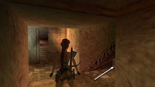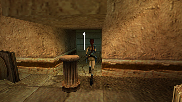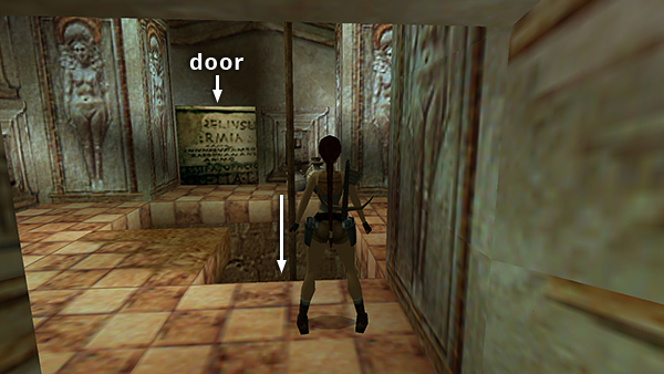 Exit the secret alcove and move to the far left corner of this ledge, nearest the large support pillar. Safety drop to the pink-tiled area below. Turn left, move toward the corner of the platform, step down onto one of the sandy colored tiles, then safety drop to the floor. Lara will take no damage if you do it this way. (screenshots)