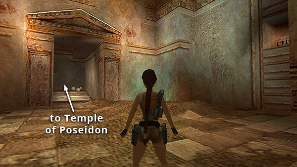 HUGE ROOM WITH HIGH PLATFORM, ROPES, AND SMALL POOL (again): Check your inventory. You should now have 4 TRIDENTS. If so, go through the large doorway near the pool to enter the next level, TEMPLE OF POSEIDON. (screenshot) If you're missing one or more TRIDENTS, check this separate page with tips for finding them.