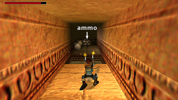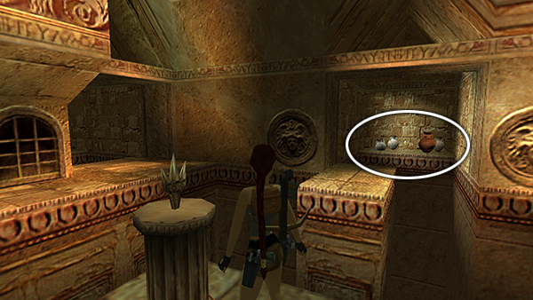 NOTE ON BUGGY ITEMS IN THE ROOM WITH THE FIRST TRIDENT: I can't promise this will work exactly as I have written, but here's what I've discovered so far: There are 4 breakable jars in the alcove on the east side of this room (i.e., the right side as you enter). (screenshot) Only two of the jars contain items, but the triggers appear to be programmed incorrectly. If you shoot only the two jars on the left side of the alcove, a box of shotgun ammo should appear on the ledge just in front of the one with the jars (or occasionally on the ledge to the north). If you shoot the two jars on the right side of the east alcove when you first enter this area, you won't receive an item, but if you wait until after destroying all 7 skeletons, then shoot the jars on the right side of the alcove, a small medipack should appear somewhere on the north side of the room. If you wait until you've destroyed all of the skeletons, you should then be able to smash all of the jars at once and get both items. These items appear in different places, which may be related to where the skeletons are when you destroy them. These screenshots show a few of the possibilities.