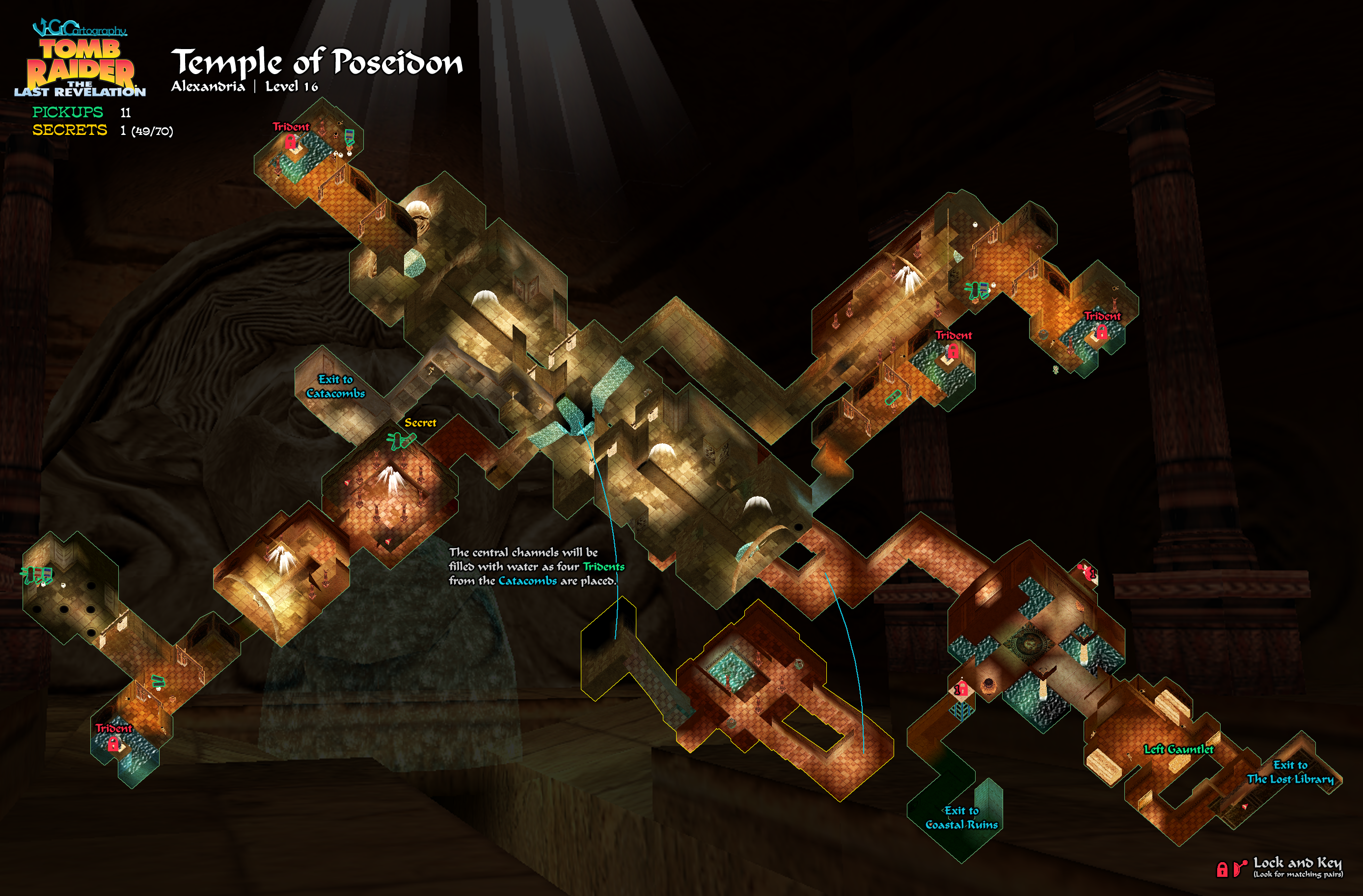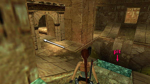 IMPORTANT: You will need 4 TRIDENTS to complete this level. If you don't have all of them, you should return to the CATACOMBS to get them. If you've already spent time exploring the TEMPLE OF POSEIDON and can't find your way back, return to the JUNCTION WITH DEEP PIT and scale the climbable wall in the northeast corner. (screenshot) Position Lara's feet on the lowest rung of the ladder at the top, then backflip into the alcove. Follow the passage back to the CATACOMBS. Use these notes to locate any missing tridents.)