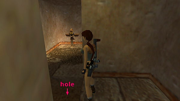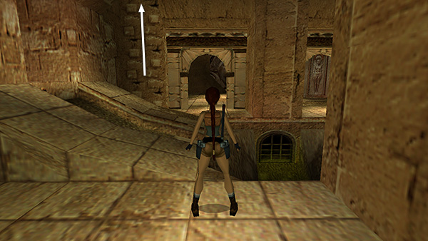 NOTE: If you took any damage while outrunning the wraith, you can jump across the hole in the floor and run down the stairs into the CATACOMBS to restore Lara's health. Then return to the opening near the bird statue.