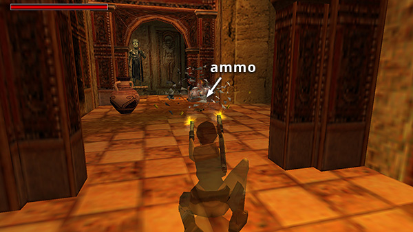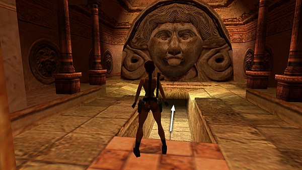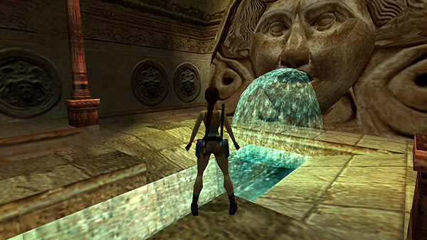 Crawl through the opening below the huge carved face. (screenshot) Climb out of the crawlspace and continue toward the small room with the FIRST POSEIDON STATUE. Shoot the breakable jars to the right of the doorway to get some Uzi ammo (3). (screenshot) Then jump over the pool to the pedestal with the statue. Press Action to select the TRIDENTS and Action again to use one.