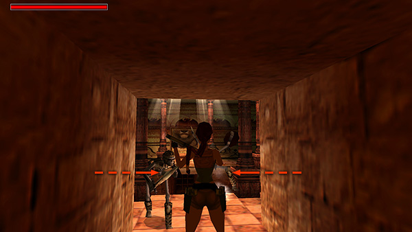 SMALL ROOM WITH ROUND BURNERS: Jump back across the pool and then carefully enter the room on the left. Each black circle on the floor is a burner, which will ignite if Lara gets too close. So either jump over them or walk between those tiles at the corners to avoid injury. At the back of the room is a cluster of jars. When Lara stands near them, 2 skeletons (3-4) rise from the floor behind her. Roll and use a grenade or two to take care of them. This should break the jars in the process. Pick up normal arrows, plus wideshot and regular shotgun ammo (4-6). Exit carefully, avoiding the burners. (screenshots)