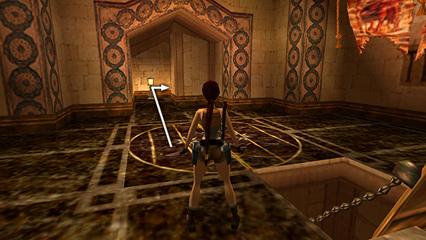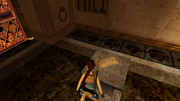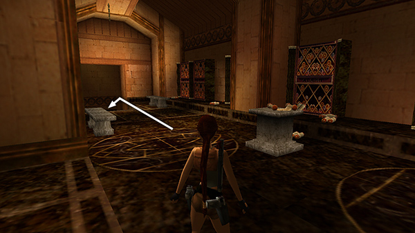 DOOR A – FIRE CIRCLE SCROLL ROOM: Push open the left door on the lower level, north side of the MAIN HALL. Follow the hallway and break the ceramic jar to get the small medipack and Uzi ammo inside (18-19). Continue to a room with a stone pedestal, banners hanging from the ceiling, and an elaborate golden circle inscribed on the floor. (screenshots)