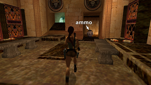 ARCHIVES – FIRST ROOM WITH LADDER: This small room contains several stone benches. There are scrolls scattered about and more scrolls stored in shelves lining the walls. Climb the ladder to the upper level. (screenshot) Go around to the opposite side of the balcony and shoot the vases. The second one contains a small medipack (21). (screenshot) Climb back down the ladder.