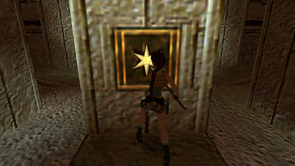 ROOM WITH TWO HUGE GEARS – FIRST GOLDEN STAR: As you enter the room at the top of the steps, a mechanical man (1) swinging an axe emerges ahead on the right. (screenshot) This new enemy type can be challenging to defeat since explosives can't harm him, and his metal hide repels bullets. The aquamarine gem in his chest is his vulnerable spot. (screenshot) Sometimes but not always, you'll hear him grunt when you score a direct hit, and he'll let out a longer groan when he's about to fall, so you can stop shooting. If you run to meet him as he comes around the center pillar toward you, then hop back firing, you can take him out with 4-5 wideshot shotgun blasts at close range, a few more regular shotgun blasts, or about 25 direct hits with the pistols. If you're using pistols, keep firing as you hop back. Then, when the mechanical man gets close, jump past him, roll, and start backing up while shooting again. Don't let him back Lara into a corner. Once you've taken care of him, use the crowbar to pry the GOLDEN STAR (4) out of the column. (screenshot)