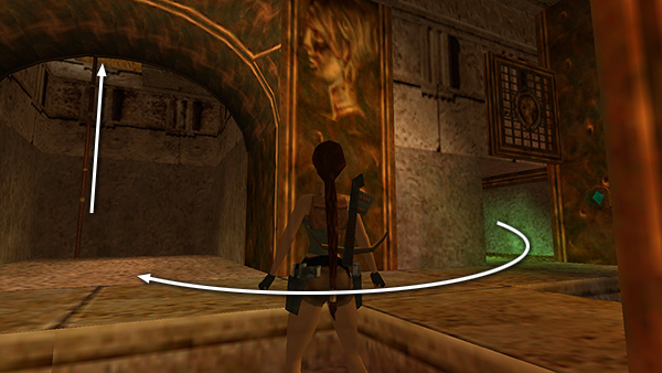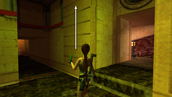 To get past the next blade, walk to the edge, hop back once, and then take a standing jump to grab the pole, climb up three times, wait for the blade to move to the front right corner (so it's about to pass in front of Lara), and then quickly climb up twice and backflip. Or, stand at the edge of the opening, wait for the blade to move to the far right corner, then take a standing jump to grab the pole and immediately backflip onto the ledge above and behind. Shoot the ceramic vase for a small medipack (1) if you didn't get it earlier. Next, position Lara so she's facing west or south, so there's no wall behind her on the upper level. Then repeat the sequence described above to get past the third blade. Follow the corridor back to the MAIN HALL. (screenshots)