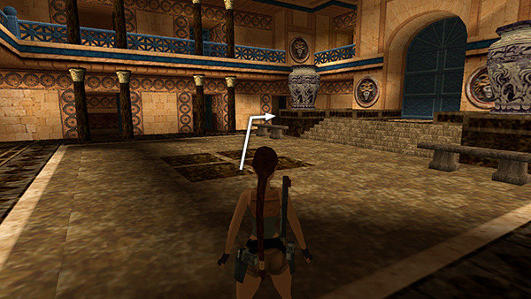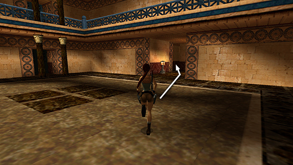 Cutscene: In the usual version of this scene, a mechanical man runs into the room, mounts the bronze horse and begins riding around. If you use the grenade trick described above, the grenade should land on the floor in front of the mechanical man just as he emerges from the alcove, and you'll see it explode during the cutscene. This is the only time he is vulnerable to explosives. Now, instead of mounting the bronze horse and charging at Lara, as he would normally do, he just paces around the horse.