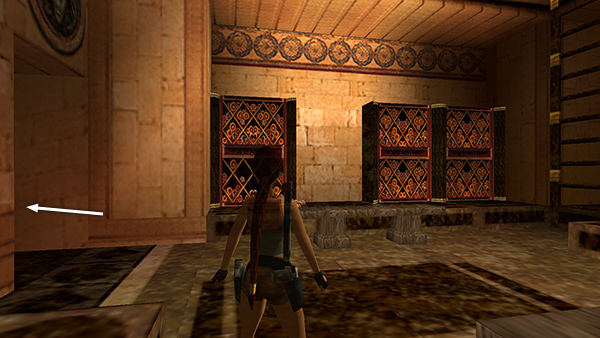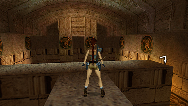DOOR K – ROOM WITH LIONS' HEADS: Go through the right door on the upper level, south side. Light a flare and save the game before sliding down the ramp. As you slide, jump to grab the ladder above and in front of you just before the end of the ramp. Climb up to emerge on top of a huge statue of a lion's head. You'll hear a rumbling as a metal globe rolls down the ramp on the opposite side of the room. You're safe up here. Take a running jump from the top of the lion's head to the long ledge on the right (west) wall. This is SECRET #3 (52/70), a large medipack and normal arrows (23-24). Safety drop to the ground. (screenshots)