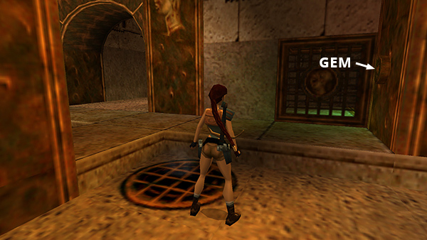 After you defeat the mechanical man, run up the ramp where the globe rolled down and stand at the top as a second globe sails over Lara's head and rolls into the trench. Take a standing jump from the top of the ramp to grab the switch on the wall to the left. This raises a large stone block in the middle of the room. (screenshots)