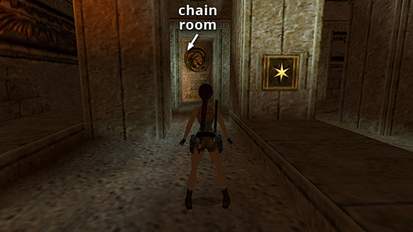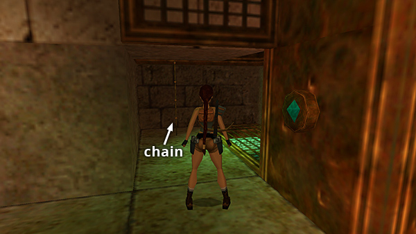 MAZELIKE ROOMS WITH SWINGING CHAINS: At the bottom of the ladder, head to the left (west) side of the room. There are two doorways here. Go through the one on the left. (The one on the right eventually leads you to the same place, but the left path is a little less complicated.) The room beyond the doorway has swinging chains that will hurt Lara if they hit her. You can avoid them by approaching on either side and running carefully past them, or by staying to either side and crawling underneath them. Move past the first chain, then the second, then turn left into a small room with a spinning gear. Stand at the edge of the metal trapdoor with the gear on Lara's left and press Action to open the trapdoor. (screenshots)
